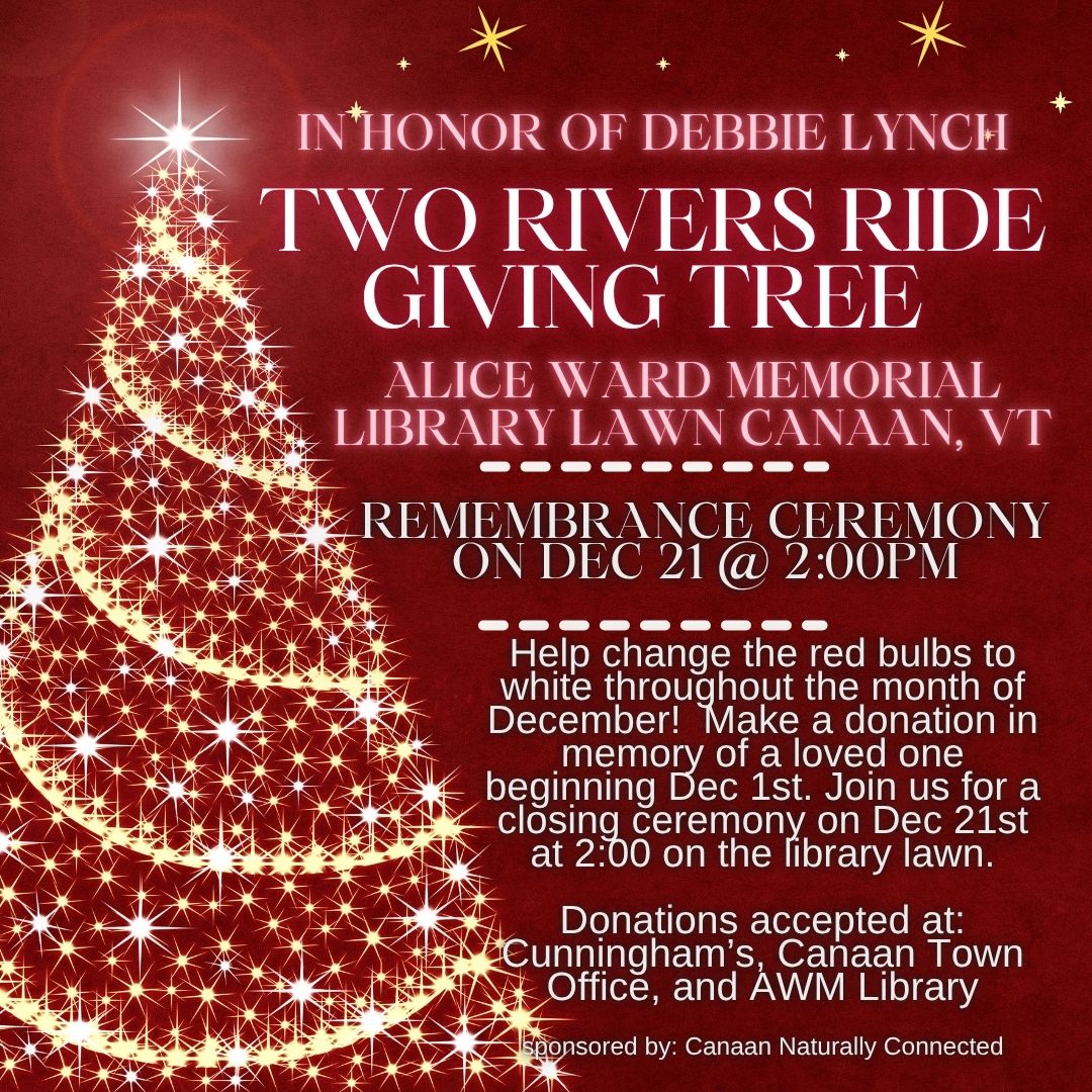 Canaan Naturally Connected looks forward to supporting Two Rivers Ride again this December to help those in need. We also are honoring the originator of this event, Debbie Lynch. The North Country and Canaan sadly lost a driving force of kindness in June of this year. If you would like to donate towards a bulb in remembrance of someone, please see Cunningham’s Full Service Station, Canaan Town Office, Alice Ward Memorial Library, or a member of CNC. Another option is to go to our website canaanvt.com, click the “donate or shop” tab, choose one of the options (PayPal or Venmo). Please make sure you put in the remarks “The Giving Tree” and who your donation is honoring. The closing ceremony will be December 21, 2:00 at the Alice Ward Memorial Library, Canaan VT. Thank you!