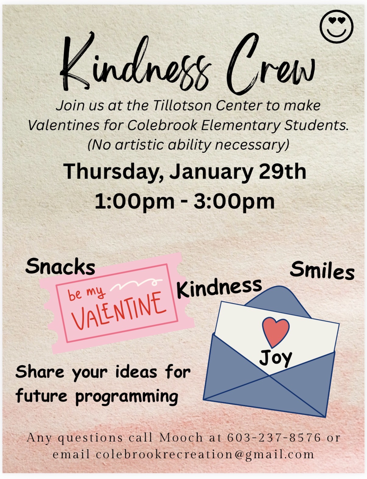 Join us at the Tillotson Center to make Valentines for Colebrook Elementary students. 💖 No artistic ability necessary 😉 There will be snacks, music, and card supplies provided to stimulate our creativity while enjoying one […]
