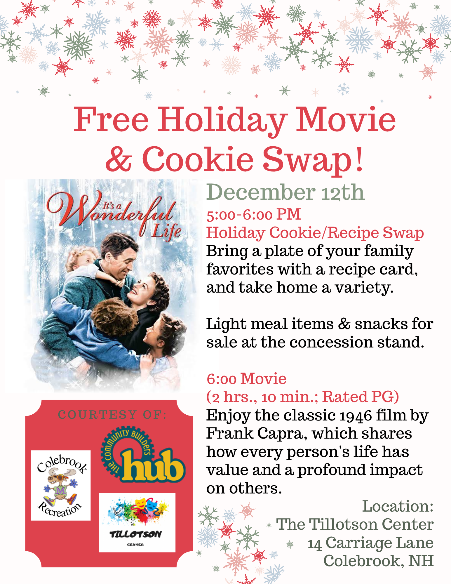 Dec 12 5:00 pm - 8:00 pm Free Holiday Movie & Cookie Swap The Tillotson Center 14 Carriage Lane, Colebrook Event Details Get Directions