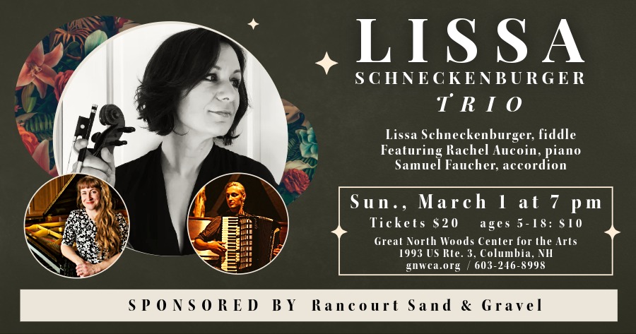 Great North Woods Center for the Arts 1993 US-3, Columbia, NH, United StatesLissa Schneckenburger, fiddle Rachel Aucoin, piano Samuel Faucher, accordion